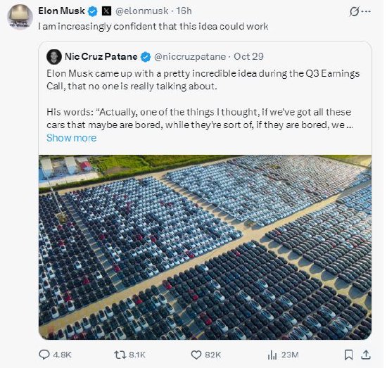 马斯克周三在社交平台上回应了一位网友分享的他在特斯拉财报会议上提出的“特斯拉车队即数据中心”的想法,并表示:“我越来越相信这个想法是可行的。”