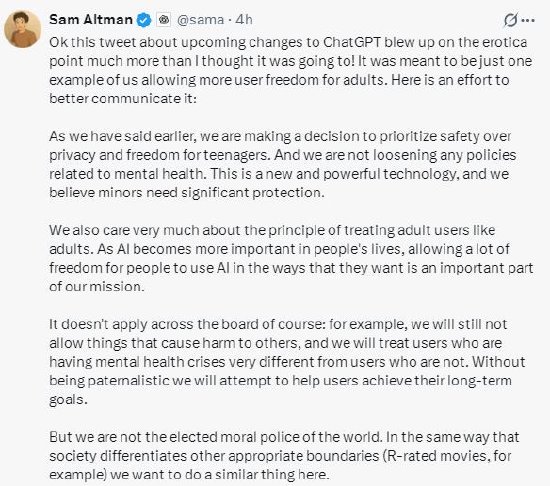 奥特曼在周三的一条帖子中就此进行了澄清,他写道:“好吧,这条关于即将到来的ChatGPT变化的推文在情色点上比我想象的要大得多!这只是我们为成年人提供更多用户自由的一个例子。这里有一个更好的沟通方法: