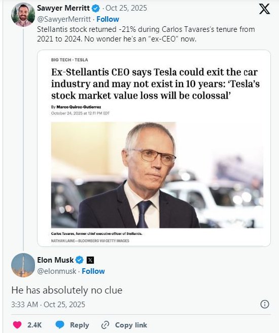 电动汽车分析师索耶·梅瑞特在社交平台X上分享了塔瓦雷斯的这次采访内容,并评论称:“在塔瓦雷斯2021年至2024年的任期内,斯特兰蒂斯的股票回报率为-21%。难怪他现在是‘前CEO’。”