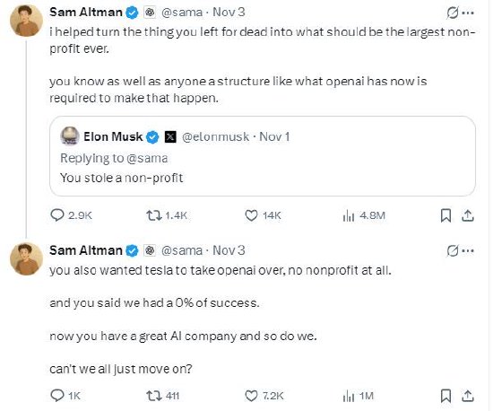 奥特曼在另一条帖子中写道:“你还想让特斯拉接管OpenAI,这根本不是非营利。你说我们的成功率是0%。现在你有了一家很棒的AI公司,我们也一样。我们就不能向前看吗?”