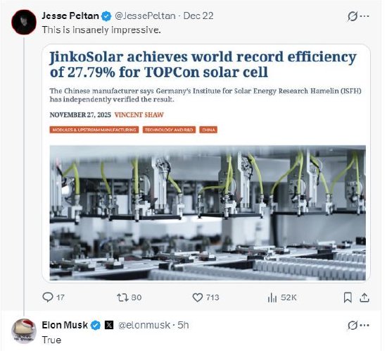 本周,社交平台X上的一位用户分享了有关晶科能源这项新纪录的报道,并评论称:“这真是令人疯狂地印象深刻。”