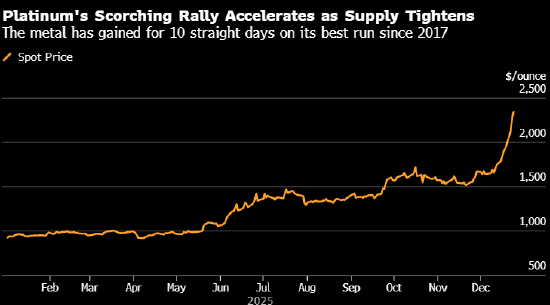 铂金今年以来上涨约140%。近期涨势反映伦敦市场供应趋紧迹象,一些银行将实物铂金存放至美国,以规避潜在关税风险。