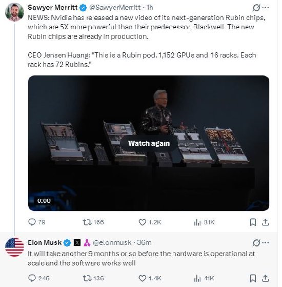 电动汽车分析师索耶梅瑞特在X上发帖称:“英伟达发布了下一代Rubin芯片的新视频,该芯片的性能比上一代Blackwell强5倍。新的Rubin芯片已经投入生产。”