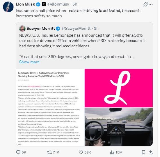 电动汽车分析师索耶·梅瑞特在X上分享消息称:美国保险公司Lemonade宣布,将为特斯拉车主提供50%的保费折扣,前提是车辆的 FSD(全自动驾驶)功能启用,因为数据显示该功能可以降低事故发生率。