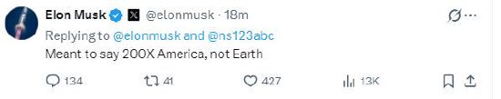 不过,马斯克稍后发帖更正了自己的一个口误:“我的本意是说‘美国的200倍’,而不是‘地球的200倍’。”