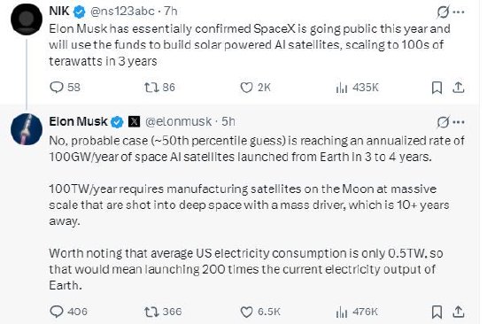 一位网友在X上发帖称:“埃隆·马斯克基本上已经确认SpaceX将于今年上市,并将利用募集的资金建造太阳能驱动的AI卫星,目标是在三年内扩大到数百太瓦。”